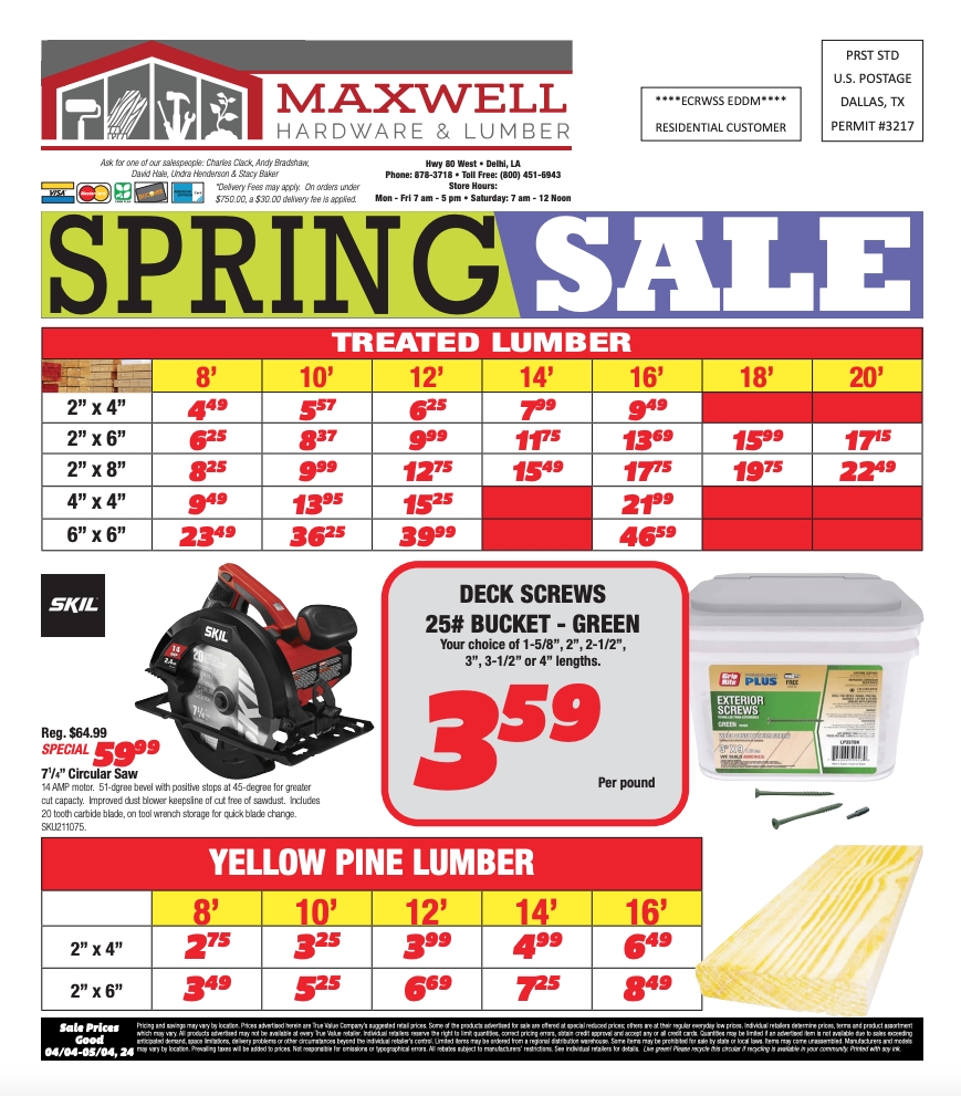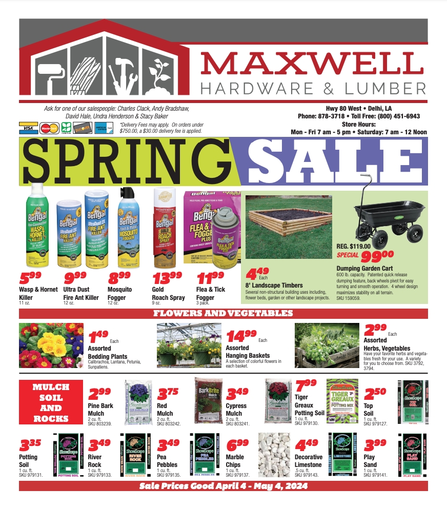 Maxwell Hardware in Delhi is currently offering an exciting spring sale with a wide variety of items on sale to help customers get ready for the warmer weather. From gardening supplies and vegetable plants to outdoor living space accessories and grills and accessories, there is something for everyone. Additionally, the sale includes lumber, fencing, roofing supplies, and other home improvement supplies at discounted prices. Whether you are looking to spruce up your backyard or tackle a home improvement project, this sale is a great opportunity to save money while getting the supplies you need. Don't miss out on this chance to get your hands on quality products at affordable prices. Ends May 4th!
